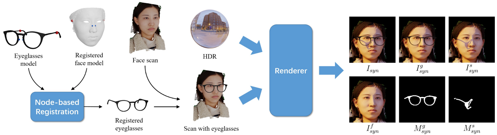 This system is the main point of the paper, but for me, it was also interesting to read about their synthetic data generation pipeline. Starting from 3D models of eyeglasses and 3D face models, they manually label four nodes where the glasses attach to the face: two fixed nodes on the temples and two floating points on the nose, “floating” meaning that these two points can drift to produce different positions of glasses on the nose. With these four nodes fixed, the system is able to find out the pose for the glasses, combine it with the face, and then the authors proceed to standard rendering in Blender, also generating the masks for glasses and their shadows to train the segmentation model:
