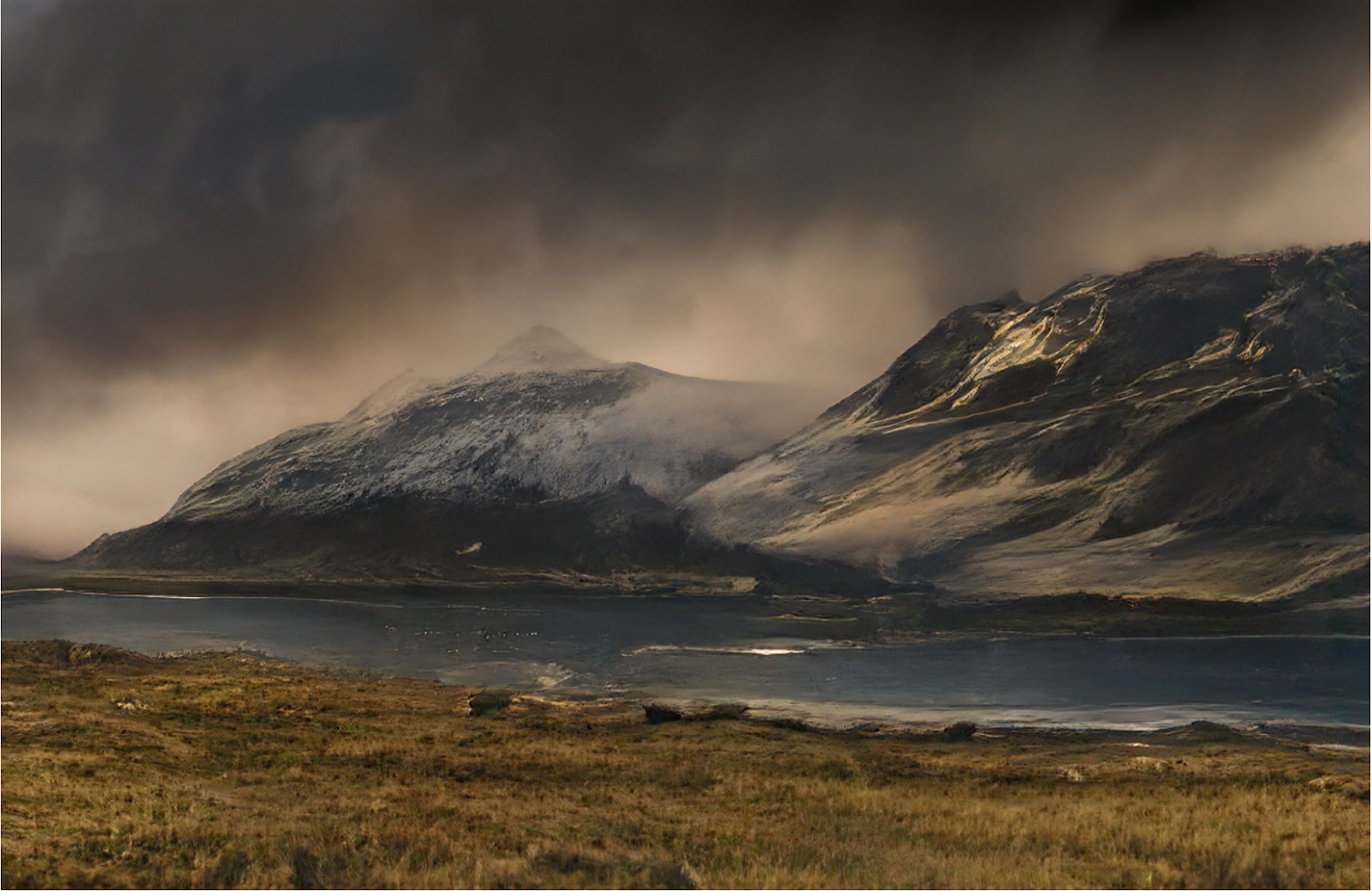 But a major point about VQ-GAN was that it could scale to far higher resolutions. Here is a sample landscape (originally 1280×832 pixels) generated by the VQ-GAN from a semantic layout, i.e., from a rough segmentation map showing where the sky, land, mountains, and grass should be: